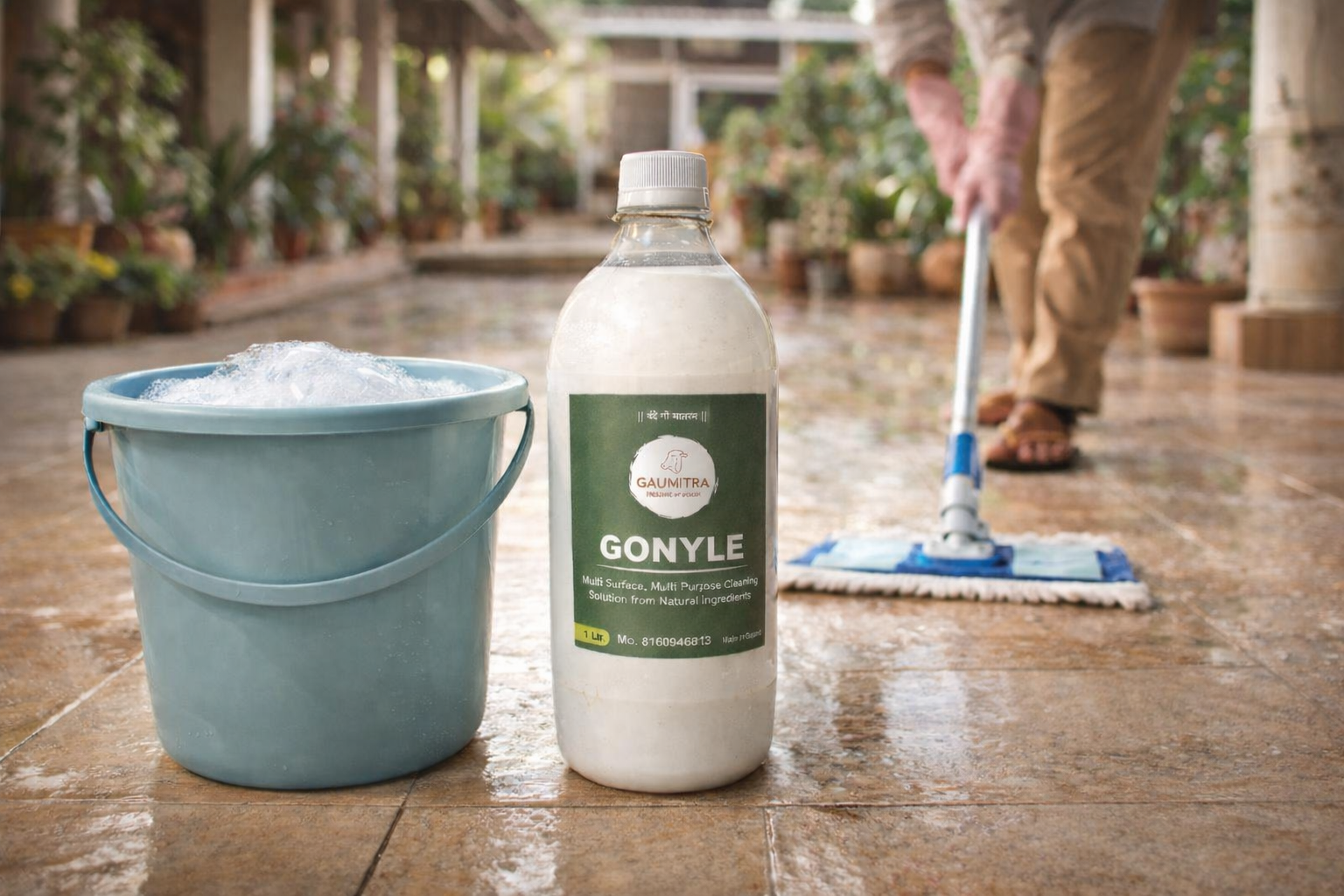 Gonyle is a herbal-based liquid floor cleaner and disinfectant enriched with cow urine extract (Gomutra) and other natural ingredients. It effectively cleans, deodorizes, and disinfects surfaces while keeping your home fresh, germ-free, and hygienic. The natural Gomutra enhances antimicrobial action and provides a purifying effect.