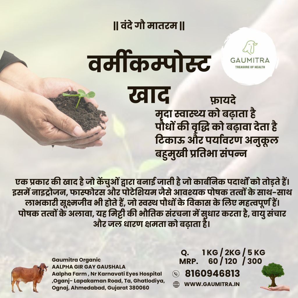 Fertilizer Vermicompost Fertilizer is a premium-quality organic manure made from pure desi cow dung. It is produced through natural decomposition by earthworms, which enhances soil fertility, improves plant growth, and increases crop yield. This fertilizer is 100% organic, chemical-free, eco-friendly, and highly nutritious for all types of plants. Cow dung naturally contains essential micronutrients, and after being processed by earthworms, it converts into a highly potent, bio-active organic fertilizer. It enriches the soil, improves moisture retention, boosts root development, and enhances the plant’s natural immunity.